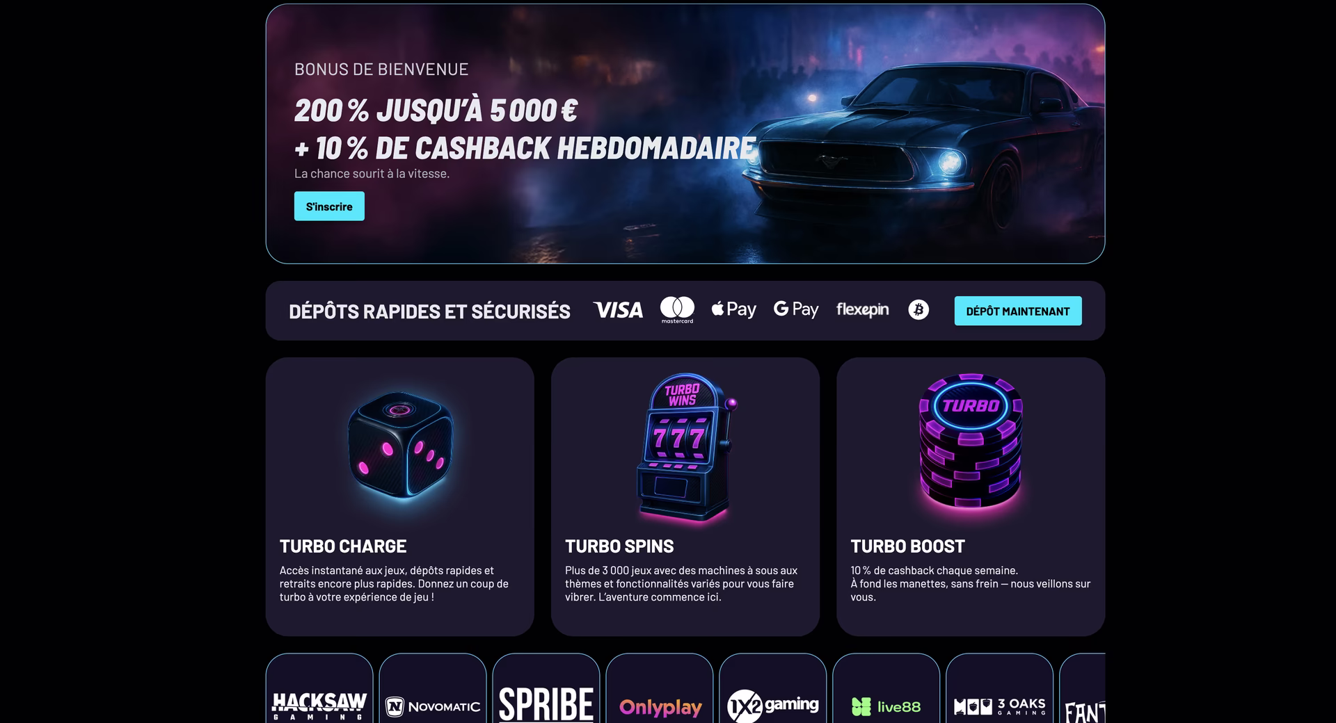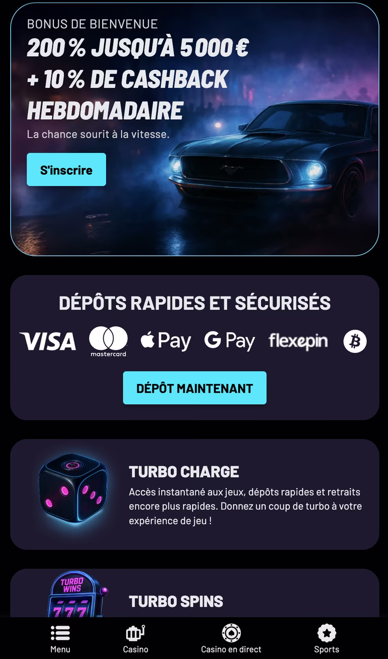 Bienvenue sur Turbo Wins, l’univers où la vitesse, la fiabilité et le plaisir se rencontrent pour offrir une expérience de casino en ligne premium en France. Sur turbowins, chaque détail est pensé pour une navigation fluide, des retraits rapides et une sécurité renforcée, afin que vous profitiez pleinement de Turbo Wins Casino dès la première minute.